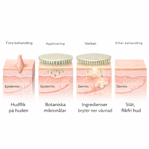 Vårt plåster använder avancerade botaniska mikronålar för att ge en säker hemmalösning för flikfri hud på bara några timmar. Det är skonsamt mot huden och verkar medan du har plåstret på för att ge slät och mjuk hud som känns frisk och naturlig.